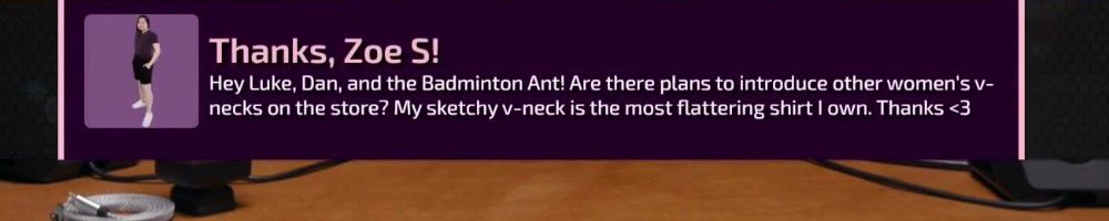 Hey Luke, Dan, and the Badminton Ant! Are there plans to introduce other women's v-necks on the store? My sketchy v-neck is the most flattering shirt I own. Thanks <3