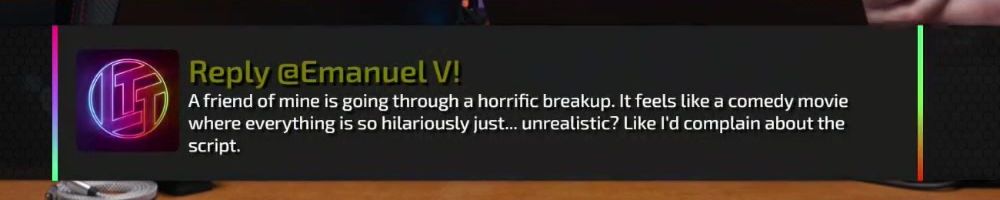 A friend of mine is going through a horrific breakup. It feels like a comedy movie where everything is so hilariously just... unrealistic? Like I'd complain about the script.