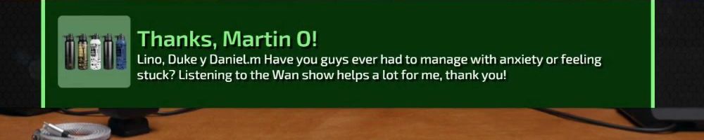 Lino, Duke y Daniel. m Have you guys ever had to manage with anxiety or feeling stuck? Listening to the Wan show helps a lot for me, thank you!