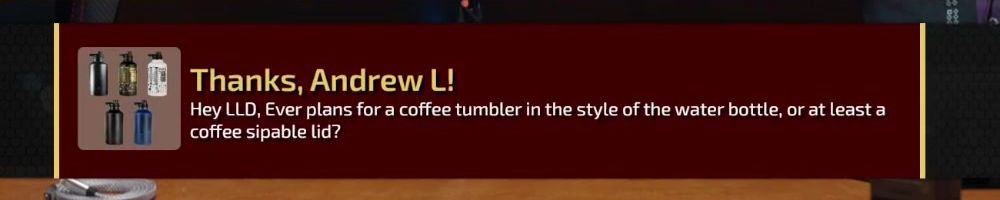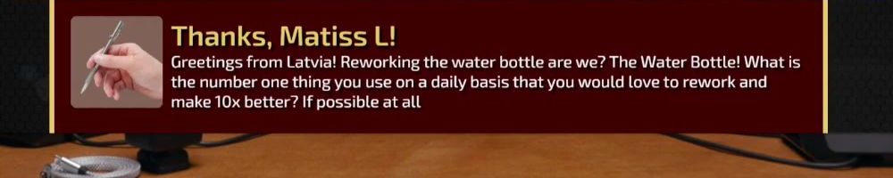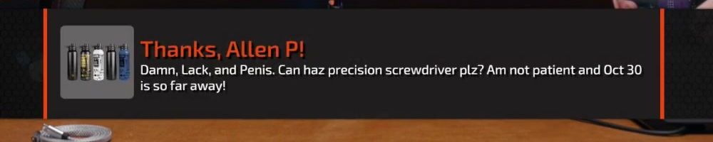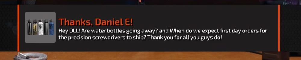 Hey DLL! Are water bottles going away? and When do we expect first day orders for the precision screwdrivers to ship? Thank you for all you guys do!