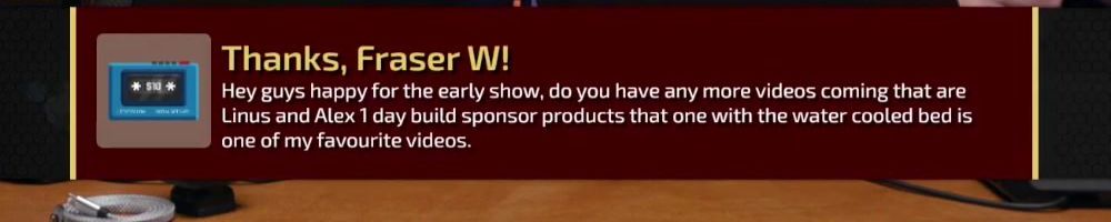 Hey guys happy for the early show, do you have any more videos coming that are Linus and Alex 1 day build sponsor products that one with the water cooled bed is one of my favourite videos.