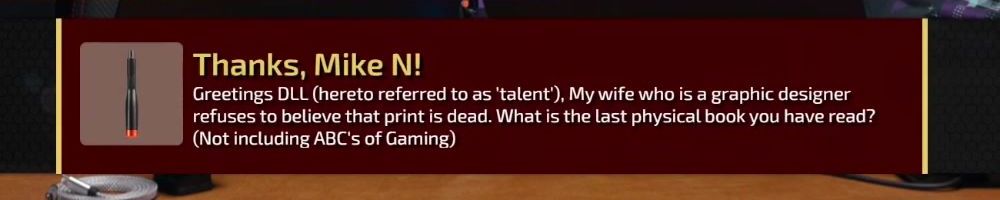 Greetings DLL (hereto referred to as 'talent'), My wife who is a graphic designer refuses to believe that print is dead. What is the last physical book you have read? (Not including ABC's of Gaming)