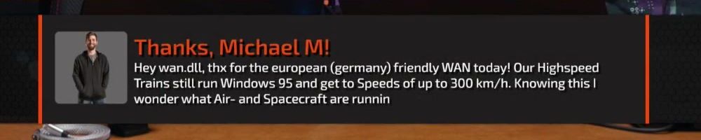 Hey wan.dll, thx for the european (germany) friendly WAN today! Our Highspeed Trains still run Windows 95 and get to Speeds of up to 300 km/h. Knowing this I wonder what Air- and Spacecraft are runnin