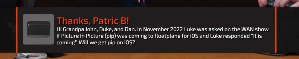Hi Grandpa John, Duke, and Dan. In November 2022 Luke was asked on the WAN show if Picture in Picture (pip) was coming to floatplane for iOS and Luke responded “it is coming”. Will we get pip on iOS?