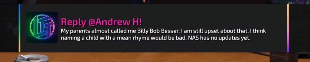 My parents almost called me Billy Bob Besser. I am still upset about that. I think naming a child with a mean rhyme would be bad. NAS has no updates yet.