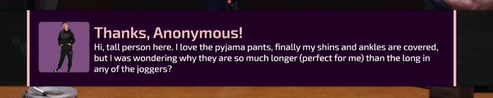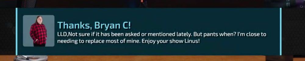 LLD,Not sure if it has been asked or mentioned lately. But pants when? I'm close to needing to replace most of mine. Enjoy your show Linus!