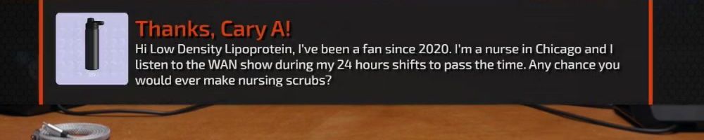 Hi Low Density Lipoprotein, I've been a fan since 2020. I'm a nurse in Chicago and I listen to the WAN show during my 24 hours shifts to pass the time. Any chance you would ever make nursing scrubs?