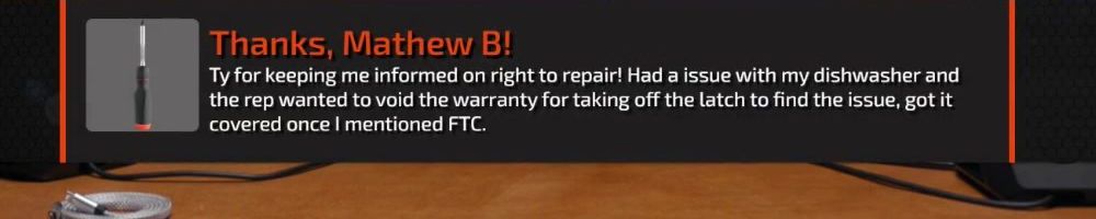 Ty for keeping me informed on right to repair! Had a issue with my dishwasher and the rep wanted to void the warranty for taking off the latch to find the issue, got it covered once I mentioned FTC.