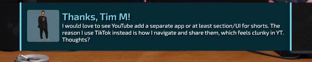 I would love to see YouTube add a separate app or at least section/UI for shorts. The reason I use TikTok instead is how I navigate and share them, which feels clunky in YT. Thoughts?