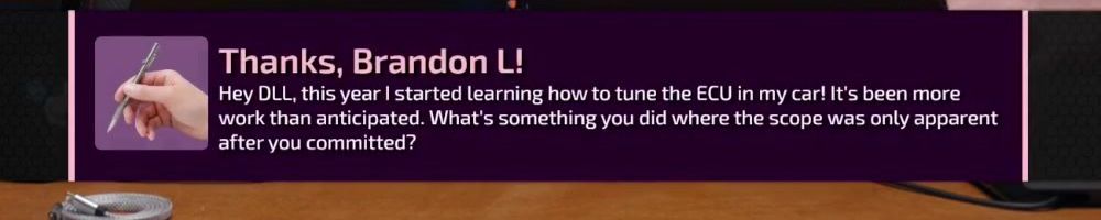 Hey DLL, this year I started learning how to tune the ECU in my car! It's been more work than anticipated. What's something you did where the scope was only apparent after you committed?