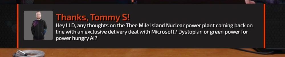 Hey LLD, any thoughts on the Three Mile Island Nuclear power plant coming back on line with an exclusive delivery deal with Microsoft? Dystopian or green power for power hungry AI?