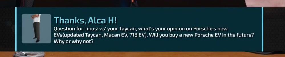 Question for Linus: w/ your Taycan, what's your opinion on Porsche's new EVs(updated Taycan, Macan EV, 718 EV). Will you buy a new Porsche EV in the future? Why or why not?