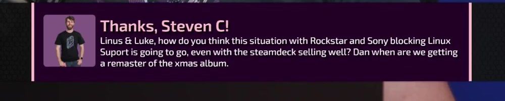 Linus & Luke, how do you think this situation with Rockstar and Sony blocking Linux Suport is going to go, even with the steamdeck selling well? Dan when are we getting a remaster of the xmas album.