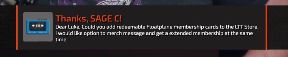 Dear Luke, Could you add redeemable Floatplane membership cards to the LTT Store. I would like option to merch message and get a extended membership at the same time.