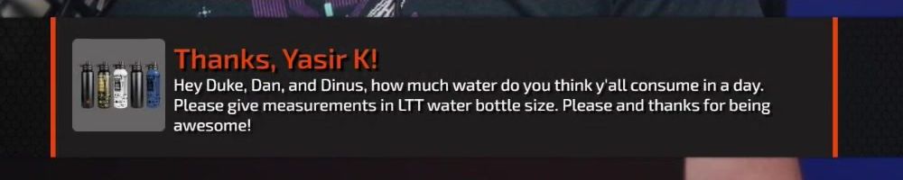 Hey Duke, Dan, and Dinus, how much water do you think y'all consume in a day. Please give measurements in LTT water bottle size. Please and thanks for being awesome!