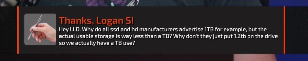 Hey LLD. Why do all ssd and hd manufacturers advertise 1TB for example, but the actual usable storage is way less than a TB? Why don't they just put 1.2tb on the drive so we actually have a TB use?