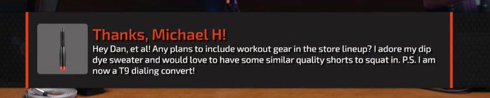 Hey Dan, et al! Any plans to include workaut gear in the store lineup? I adore my dip dye sweater and would love to have some similar quality shorts to squat in. P.S. I am now a T9 dialing convert!