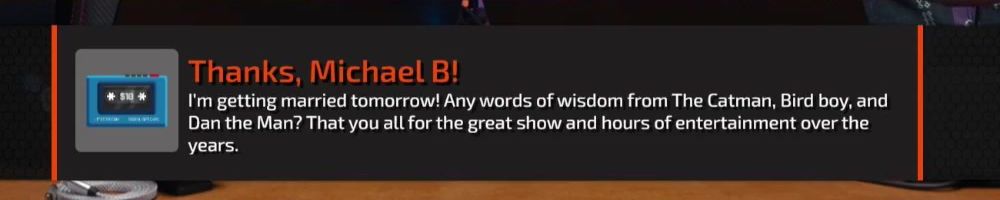 I'm getting married tomorrow! Any words of wisdom from The Catman, Bird boy, and Dan the Man? That you all for the great show and hours of entertainment over the years.
