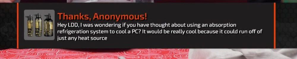 Hey LDD, I was wondering if you have thought about using an absorption refrigeration system to cool a PC? It would be really cool because it could run off of just any heat source
