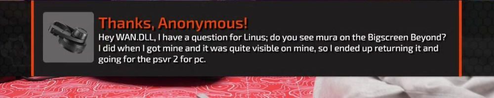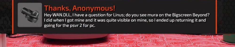 Hey WAN.DLL, I have a question for Linus; do you see mura on the Bigscreen Beyond? I did when I got mine and it was quite visible on mine, so I ended up returning it and going for the psvr 2 for pc.