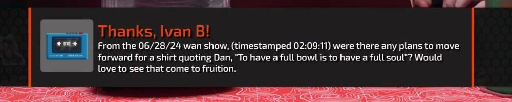 From the 06/28/24 wan show, (timestamped 02:09:11) were there any plans to move forward for a shirt quoting Dan, "To have a full bowl is to have a full soul"? Would love to see that come to fruition.