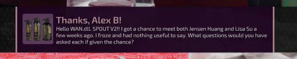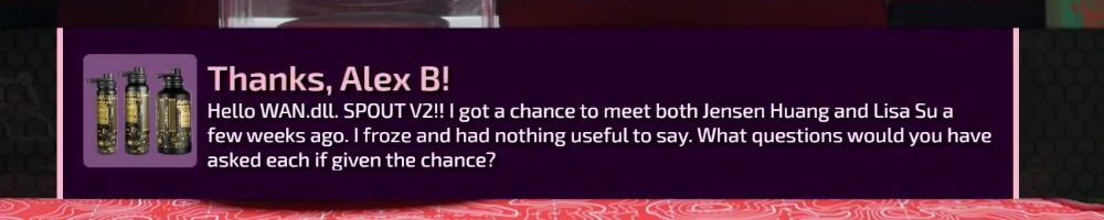 Hello WAN.dll. SPOUT V2!! I got a chance to meet both Jensen Huang and Lisa Su a few weeks ago. I froze and had nothing useful to say. What questions would you have asked each if given the chance?