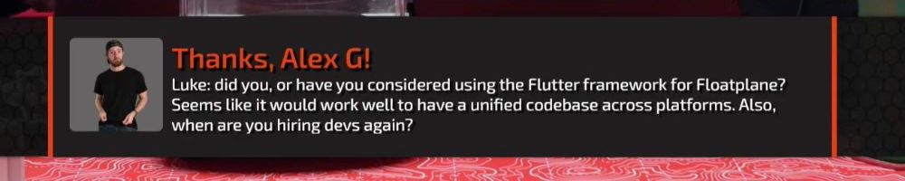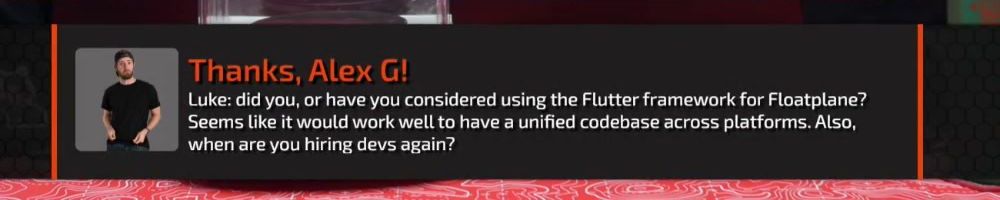 Luke: did you, or have you considered using the Flutter framework for Floatplane? Seems like it would work well to have a unified codebase across platforms. Also, when are you hiring devs again?