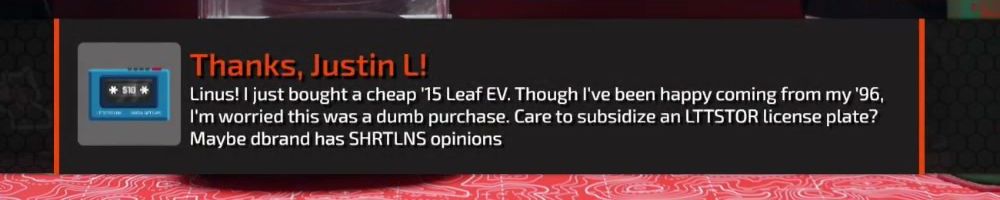 Linus! I just bought a cheap '15 Leaf EV. Though I've been happy coming from my '96, I'm worried this was a dumb purchase. Care to subsidize an LTTSTOR license plate? Maybe dbrand has SHRTLNS opinions