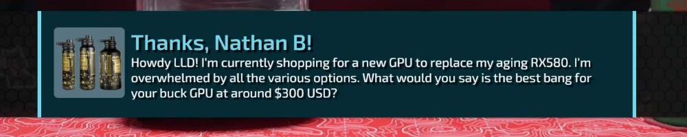 Howdy LLD! I'm currently shopping for a new GPU to replace my aging RX580. I'm overwhelmed by all the various options. What would you say is the best bang for your buck GPU at around $300 USD?