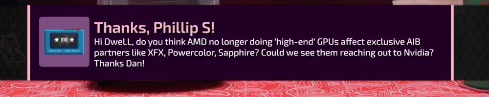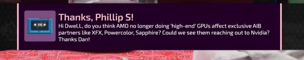 Hi DwelL, do you think AMD no longer doing 'high-end' GPUs affect exclusive AIB partners like XFX, Powercolor, Sapphire? Could we see them reaching out to Nvidia? Thanks Dan!