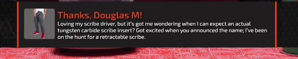 Loving my scribe driver, but it's got me wondering when I can expect an actual tungsten carbide scribe insert? Got excited when you announced the name; I've been on the hunt for a retractable scribe.