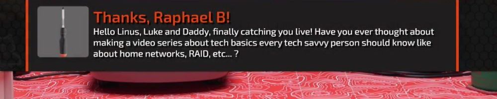 Hello Linus, Luke and Daddy, finally catching you live! Have you ever thought about making a video series about tech basics every tech savvy person should know like about home networks, RAID, etc... ?