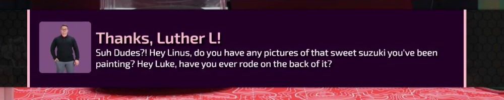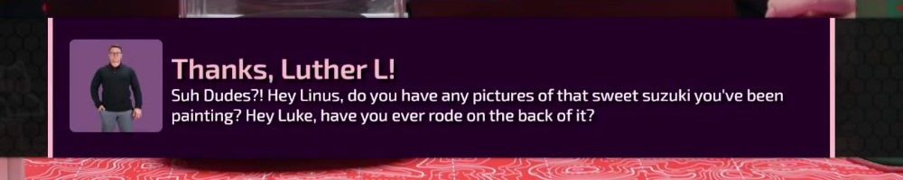 Suh Dudes?! Hey Linus, do you have any pictures of that sweet suzuki you've been painting? Hey Luke, have you ever rode on the back of it?