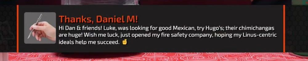 Hi Dan & friends! Luke, was looking for good Mexican, try Hugo's; their chimichangas are huge! Wish me luck, just opened my fire safety company, hoping my Linus-centric ideals help me succeed. 🤗