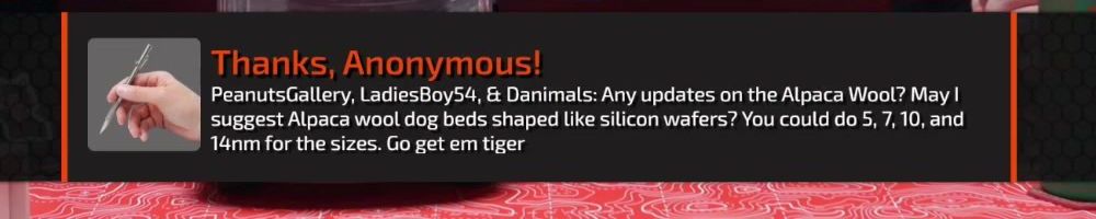 PeanutsGallery, LadiesBoy54, & Danimals: Any updates on the Alpaca Wool? May I suggest Alpaca wool dog beds shaped like silicon wafers? You could do 5, 7, 10, and 14nm for the sizes. Go get em tiger