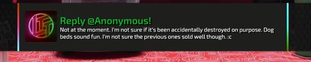 Not at the moment. I'm not sure if it's been accidentally destroyed on purpose. Dog beds sound fun. I'm not sure the previous ones sold well though. :c