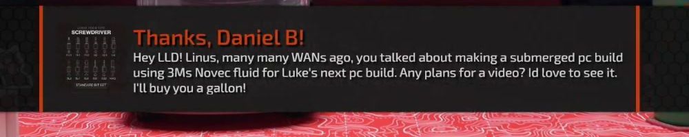 Hey LLD! Linus, many many WANs ago, you talked about making a submerged pc build using 3Ms Novec fluid for Luke's next pc build. Any plans for a video? Id love to see it. I'll buy you a gallon!