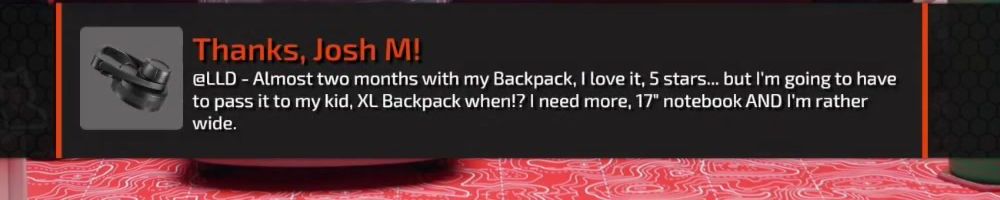 @LLD - Almost two months with my Backpack, I love it, 5 stars... but I'm going to have to pass it to my kid, XL Backpack when!? I need more, 17" notebook AND I'm rather wide.