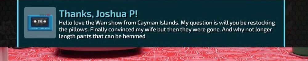 Hello love the Wan show from Cayman Islands. My question is will you be restocking the pillows. Finally convinced my wife but then they were gone. And why not longer length pants that can be hemmed