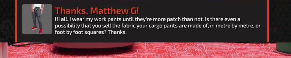 Hi all. I wear my work pants until they're more patch than not. Is there even a possibility that you sell the fabric your cargo pants are made of, in metre by metre, or foot by foot squares? Thanks.