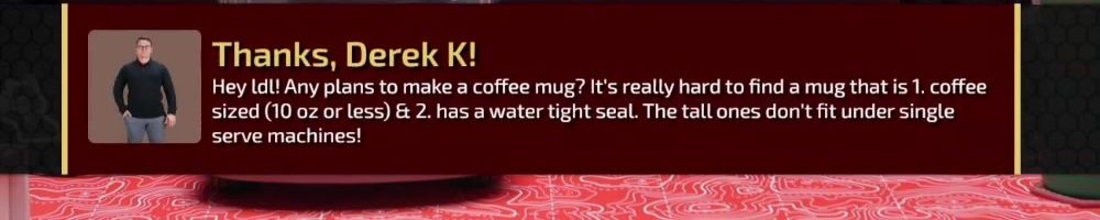 Hey dl! Any plans to make a coffee mug? It's really hard to find a mug that is 1. coffee sized (10 oz or less) & 2. has a water tight seal. The tall ones don't fit under single serve machines!