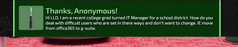 Hi LLD, I am a recent college grad turned IT Manager for a school district. How do you deal with difficult users who are set in there ways and don't want to change. IE move from office365 to g-suite.