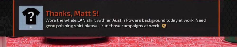 Wore the whale LAN shirt with an Austin Powers background today at work. Need gone phishing shirt please, I run those campaigns at work. 😅