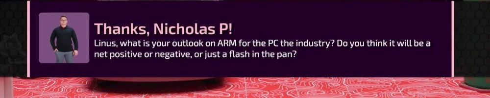 Linus, what is your outlook on ARM for the PC the industry? Do you think it will be a net positive or negative, or just a flash in the pan?