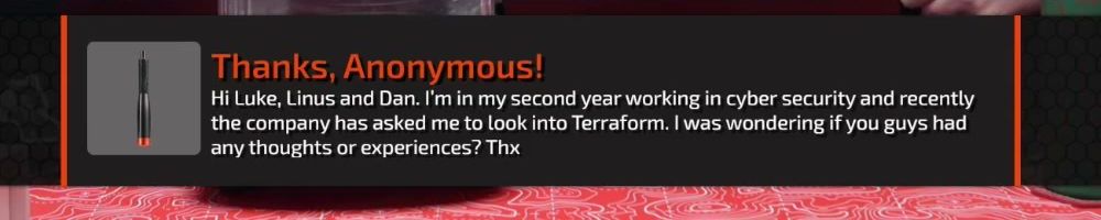 Hi Luke, Linus and Dan. I'm in my second year working in cyber security and recently the company has asked me to look into Terraform. I was wondering if you guys had any thoughts or experiences? Thx