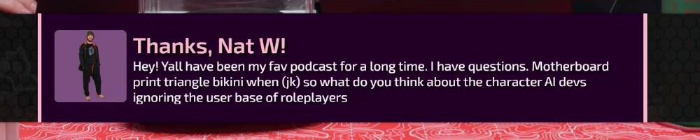 Hey! Yall have been my fav podcast for a long time. I have questions. Motherboard print triangle bikini when (jk) so what do you think about the character AI devs ignoring the user base of roleplayers