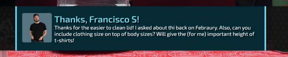 Thanks for the easier to clean lid! I asked about thi back on Febraury. Also, can you include clothing size on top of body sizes? Will give the (for me) important height of t-shirts!