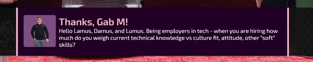 Hello Lamus, Damus, and Lumus. Being employers in tech - when you are hiring how much do you weigh current technical knowledge vs culture fit, attitude, other "soft" skills?