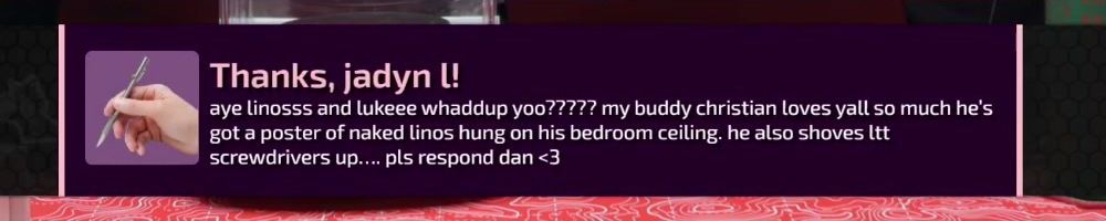 aye linoss and lukeee whaddup you???? my buddy christian loves yall so much he's got a poster of naked linos hung on his bedroom ceiling. he also shoves ltt screwdrivers up.... pls respond dan <3