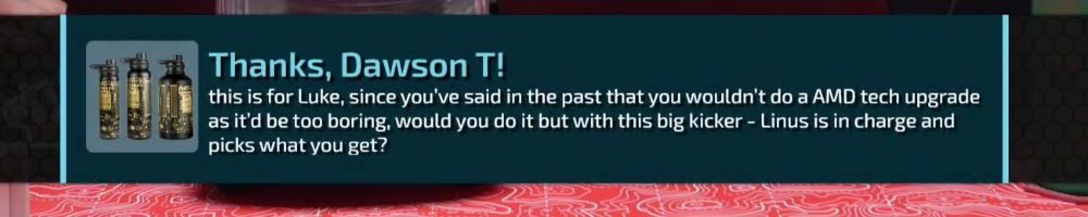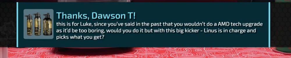 this is for Luke, since you've said in the past that you wouldn't do a AMD tech upgrade as it'd be too boring, would you do it but with this big kicker - Linus is in charge and picks what you get?